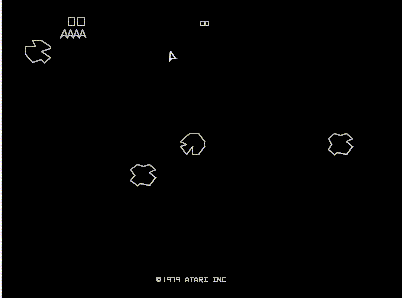 Classic, monochrome vector graphics. Production run of Lunar Lander machines was cut short to get Asteroids into the arcades as fast as possible. Therefore the first Asteroids machines still had Lunar Lander cabinet artwork. Asteroids was the first game to give the player complete mobility within its playing environment and complex inertial controls to master.