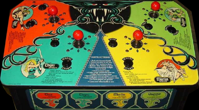 Uncommon for most games of the time, a credit buys the player ONE life with a health gauge. This health is lost from damage inflicted by monsters and also as a function of time, so even if you avoid everything you will eventually face certain death. A player increases the amount of health he has by eating the food placed on the various levels. Some food may be destroyed by an ill-placed shot. Players can also collect keys to open doors and magic potions to use as smart bombs when the odds are overwhelming.