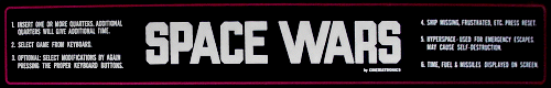Button controls were Rotate Left, Rotate Right, Thrust, Fire and Hyperspace. Timed game usually set for 1:30 per quarter. Variable settings that the players could choose (in any combination) were speeds (of ships and/or missles), sun settings (normal, blackhole or invisible sun), gravity settings (total: ships stop when you left off thrust, no gravity and settings inbetween), screen settings such as closed universe, missle bounce, etc.) Of the two ships, one looked like the asteriod ship, the other like a starship enterprise (and octagon with two drives off the back).