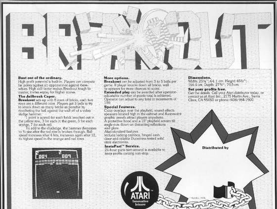The game was black and white, but the bricks were colored with an overlay on the monitor. Enormously popular, the game spawned many variations.