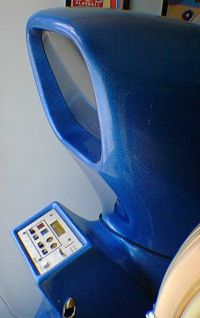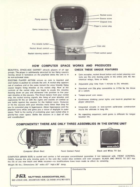 First coin-op video game ever - only 1500 produced - clone of PDP-111 computer game "Spacewar" created in 1962. Monitor was a converted tube-type TV set. Buttons consisted of left and right turn, thrust, and fire (similar to Atari Asteroids). Ship would continue to move until you turned it and used thrust to modify direction. Single player version was a battle between the player and a random-moving UFO. You couldn't collide with the UFO. If you had more points than the UFO at the end of timed play the screen would reverse video (like a photo negative) and you would continue to play in "hyperspace". There were a few 2-player models made. The cabinet was molded fiberglass with a metal-flake finish.