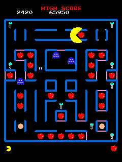 The Pac-Man formula was revamped again with this entry that added many new elements. In this game the goal was to eat keys that opened gates and allowed access to whatever foodstuff was available on the particular board. At first the keys open the closest gates, but at the harder levels keys open gates in opposite corners of the board. As always, the board had to be cleared to move on to the next level. Also added was the new Super pellet, which greatly increased Pac-Man's size and allowed him to both pass through ghosts unharmed (unless they were blue from a regular power pellet, in which case they get eaten) and eat his way through unopened gates. This pellet also gave a speed boost, activated by holding down a button. The duration of the effect could be increased by eating standard power pellets or the other (there were only two) Super pellet.