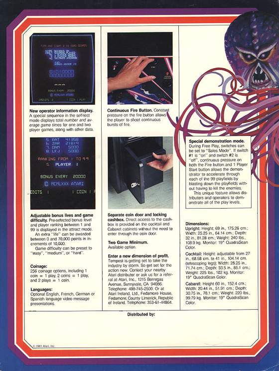 Comment: "how could you not like tempest, well, maybe if your an operator you dont like it, known for its monitor probs, excellent gameplay and color vector graphics, and the cabinet is probably the best part of it, very artistic and nice to look at design"
