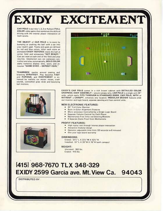 In one of the first all-color games, up to four players try to score goals using cars to move the ball. When a goal is scored, a referee comes out to set the new ball up for play.