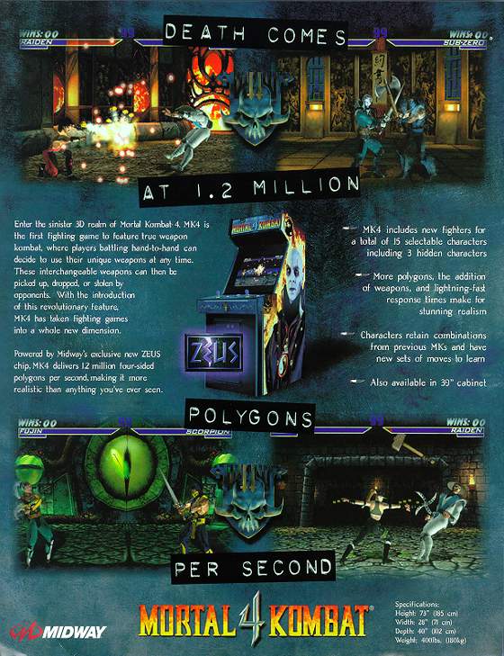 First MK game to use polygons/3D graphics. Marked a return to a dark, violent atmosphere after the cartoonish finishing moves from MK3. The game is JAMMA+ compatible, using a standard JAMMA connector plus a custom wire for the low punch and low kick buttons.