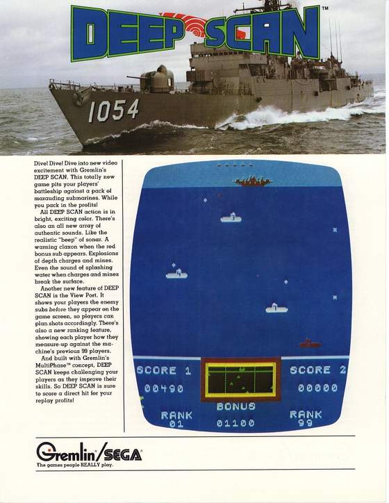 You control a battleship moving across the screen trying to hit enemy subs. You must also avoid the submarine fire. Up to two alternating players can compete.