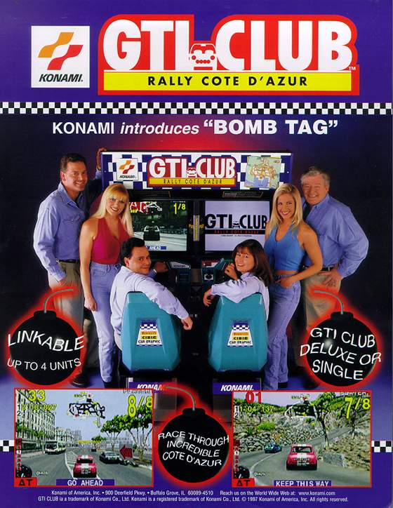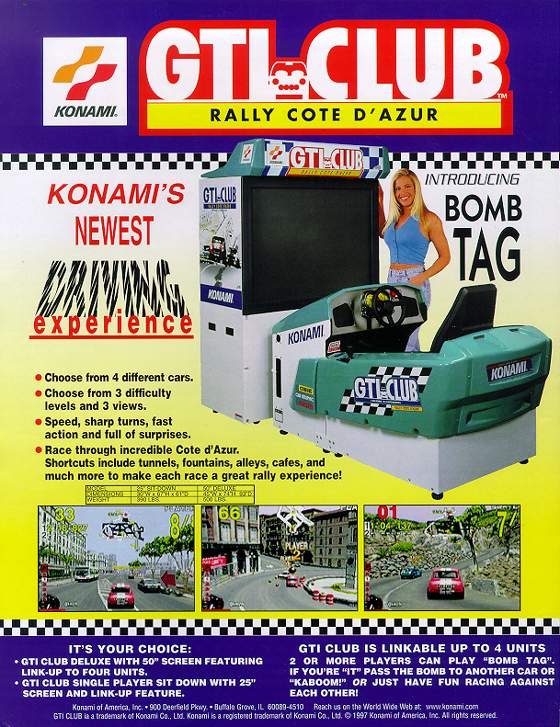 4 cars, 3 difficulty levels, 3 views. Hidden shortcuts. Offers Bomb Tag mode, an automotive version of "Hot Potato." Linkable up to four units; available wtih 25" screen or 50" screen.