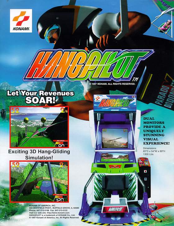 Totally unique hang gliding controls with moving pedestal and crossbar for steering and speed, respectively. Not a race, but it does feature checkpoints that you must pass to progress. Two diffuculty levels.