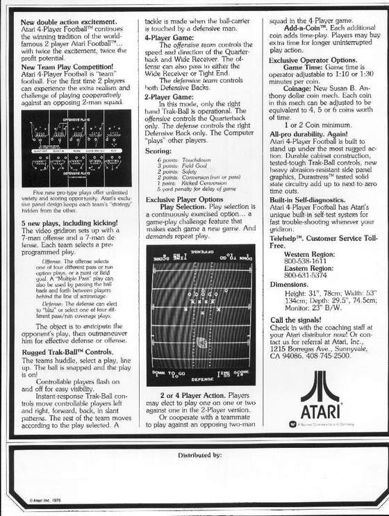 Comment: "After playing this, it felt like you really had a 400 yd passing game. We would move the cabinet further from the wall, because by half time you arm was getting ready to fall off. You either used your other hand or stood to the side of the game so your right-hand & arm were moving in a different direction. It only offered 4 different plays on both offense & defense and the graphics were simple "X's & O's", but there was nothing else like it!!! Madden just recently retired and the only other football games were electric, with vibrating plastic players that went around in circles. This game not only let you control the action, you had to physically make it happen. There have been no other games, except the 4-man that will challenge your physical stamina as Atari Football. When the 4-man unit came out, this unit was given to me and became the 1st Video Game in my collection, which is still operating in my Rec-Rm today!!"